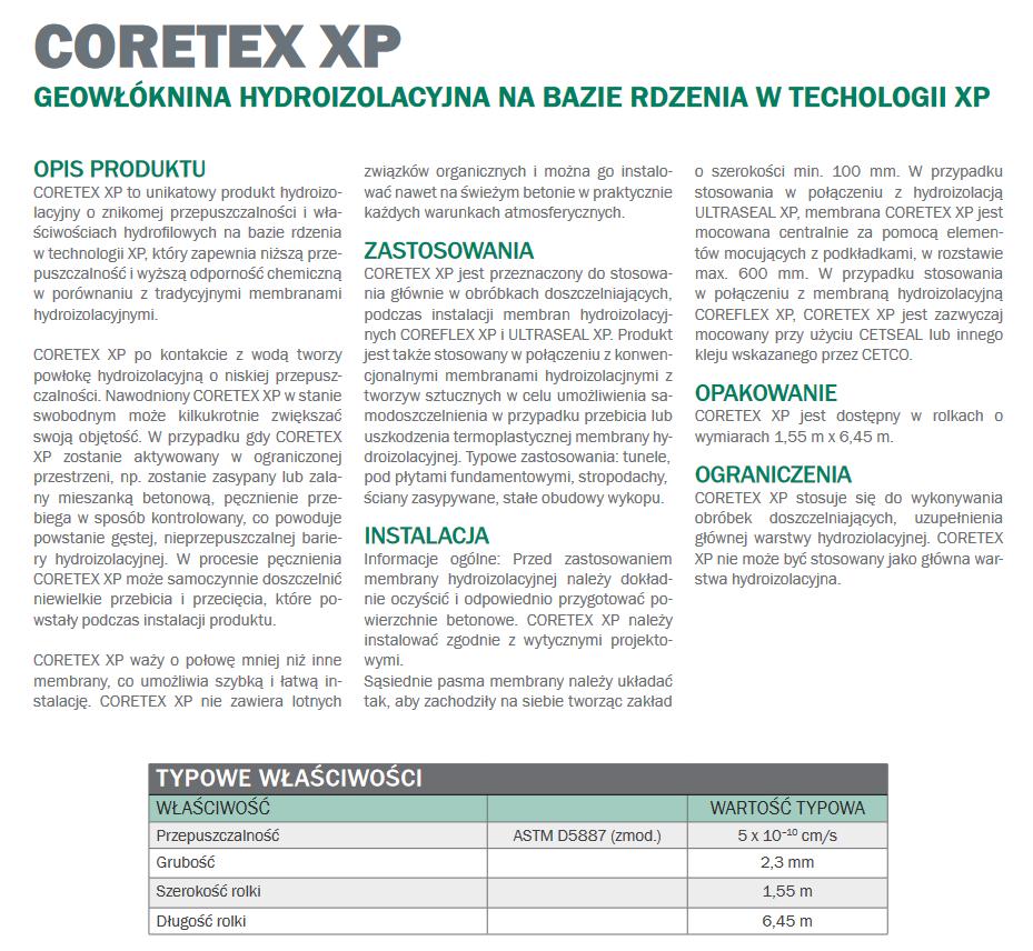 hydroizolacja budowlana CORETEX XP - geowłóknina hydroizolacyjna - samonaprawialna hydroizolacja aktywna CORETEX XP to unikatowy produkt hydroizolacyjny o znikomej przepuszczalności i właściwościach hydrofilowych na bazie rdzenia w technologii XP, który zapewnia niższą przepuszczalność i wyższą odporność chemiczną w porównaniu z tradycyjnymi membranami hydroizolacyjnymi. W procesie pęcznienia CORETEX XP może samoczynnie doszczelnić niewielkie przebicia i przecięcia, które powstały podczas instalacji produktu. Podstawowe cechyProducent: Cetco Symbol: coretex-xp Jednostka: m2 Specjalizacja: Samouszczelniająca się w przypadku przebicia membrana hydroizolacyjna. Cortex XP stosowany jest takze w połączeniu z konwencjonalnymi membranami hydroizolacjnymi z tworzyw sztucznych w celu umożliwienia samodoszczelnienia w przypadku przebicia lub uszkodzenia termoplastycznej membrany hydroizolacyjnej. Zastosowanie: hydroizolacje Sytuacje stosowaniaBardzo cienka hydroizolacja. CORETEX XP jest przeznaczony do stosowania głównie w obróbkach doszczelniających, podczas instalacji membran hydroizolacyjnych COREFLEX XP i ULTRASEAL XP. Produkt jest także stosowany w połączeniu z konwencjonalnymi membranami hydroizolacjnymi z tworzyw sztucznych w celu umożliwienia samodoszczelnienia w przypadku przebicia lub uszkodzenia termoplastycznej membrany hydroizolacyjnej. Typowe zastosowania: