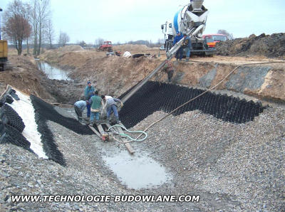 Po zalaniu sekcji betonem plastik materaca spełnia nie tylko rolę zbrojenia, lecz również deskowania. Dla tak wykonanej specjalnej konstrukcji betonowej wzmocnionej geosiatką zbędne jest wykonywanie dylatacji, ponieważ każda z komórek jest zdylatowana z sąsiednimi. Sekcja geokomórkowa, zalana betonem pozostaje faktycznie półsztywna, łatwo dostosowując się do zmiennych krzywizn w obrębie niecki wypadowej. Nakładka, stanowiąca w rzeczywistości półelastyczną membranę, dostosowuje się do zmiennych warunków miejscowych. Przy wykorzystaniu geosiatek łatwe są do wykonania połączenia z rurociągami, wylotami spustów, z bocznymi korytami itp. Możliwości elastycznego uformowania budowli w trakcie remontu stopnia są bezsprzecznie jednym z najważniejszych walorów technologii geokomórkowej. Można traktować sekcje komórkowe jako specjalne tworzywo (klocki lego?), z których tworzy się w korycie rzeki także inne konstrukcje, w tym przyległe do stopni, takie jak np. boczne koryta przepławek dla ryb. Przykłady montażu geosiatki na budowie pokazano fotografii 2.