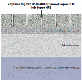 Do spoinowania okładzin z kostki brukowej lub płyt w obszarach średnio obciążonych zalecana jest fuga epoksydowa, dwuskładnikowa do kostki brukowej Sopro EPF. Do zalet jednoskładnikowej fugi do kostki brukowej Sopro PF, jak wodoprzepuszczalność oraz odporność na mróz i oddziaływanie soli, dochodzi jeszcze wyższa wytrzymałość na ściskanie i możliwość późniejszego czyszczenia eksploatowanej powierzchni okładziny przy pomocy mechanicznego odkurzania. Warstwa nośna i podłoże W celu uniknięcia osiadania materiałów, okładzina użytkowa powinna być ułożona na zaprawie drenażowej Sopro DM 610. Warstwa nośna o właściwościach drenażowych dostosowuje się do podwyższonego obciążenia.