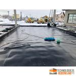 - Układanie geomembrany: następnie należy rozwinąć geomembranę na przygotowanej powierzchni, przy czym należy pamiętać, że powinna ona być rozłożona w sposób równomierny i bez napięcia. Układanie geomembrany przed zgrzewaniem wykonuje się na zakład - około 5 cm (zależnie od metody zgrzewania).