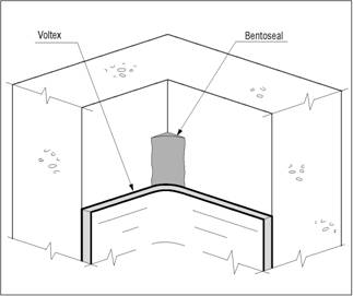 Narożniki wewnętrzne ścian należy złagodzić warstwą Bentosealu, o grubości ok. 2 cm (rys. A 3.3). Pionowe zakłady Voltexu w kolejnych rzędach powinny być wzajemnie poprzesuwane o co najmniej 30 cm (rys. A 3.4).